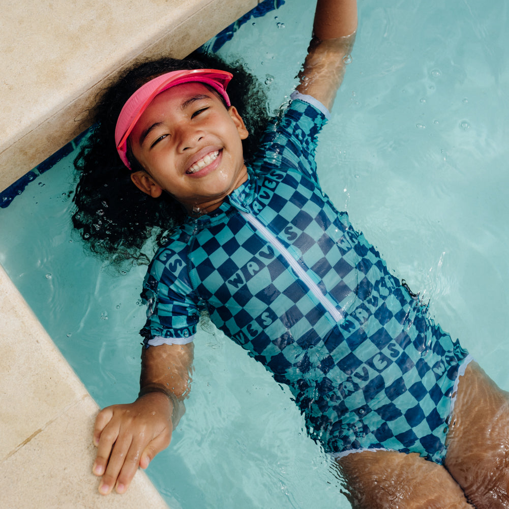 Minder smeren, meer spelen. Onze UV-zwemkleding blijft beschermen, ook in het water. Smeer alleen de onbedekte huid nog in.